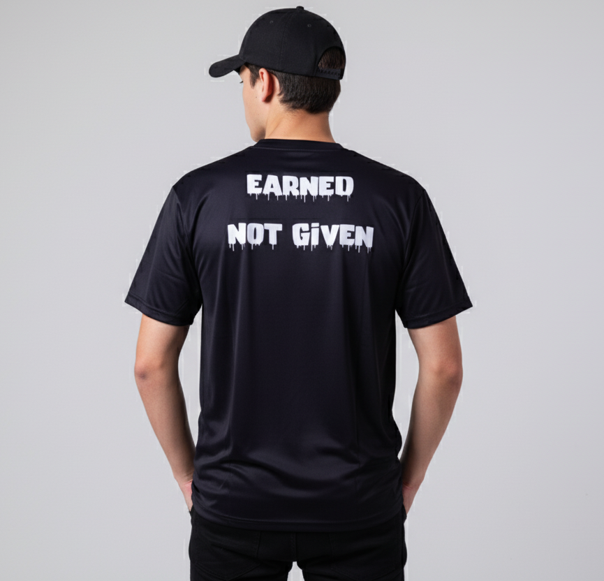 • Design: Features a striking sublimation print on the front with the powerful message “Earned Not Given” on the back, bringing motivation and style together.